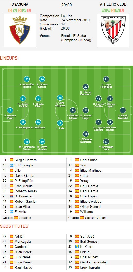 AEGoal.net cập nhật chính xác ĐỘI HÌNH RA SÂN trận Osasuna vs Bilbao diễn ra lúc 18h00 ngày 24/11 trong khuôn khổ Vòng 14 giải VĐQG Tây Ban Nha.