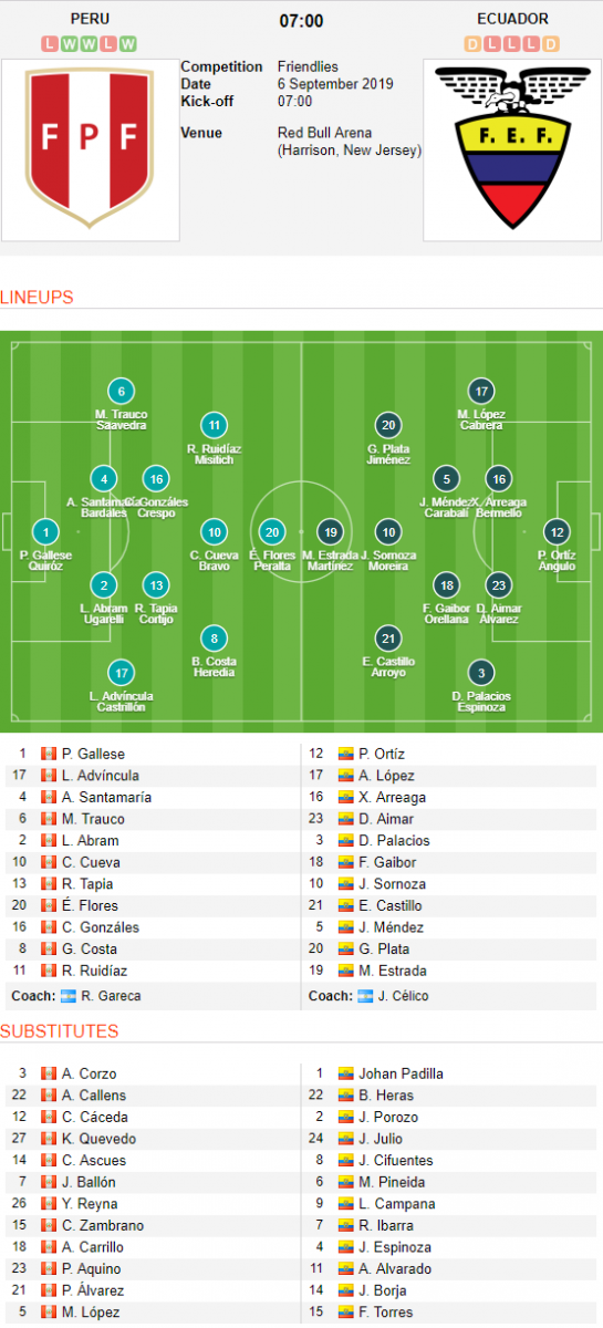 AEGoal.net cập nhật chính xác ĐỘI HÌNH RA SÂN trận Peru vs Ecuador diễn ra lúc 07h00 ngày 06/9 trong khuôn khổ Giao hữu Quốc tế.