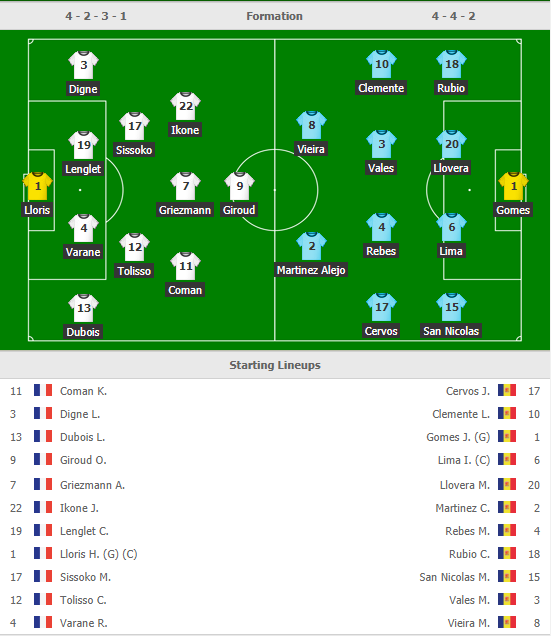 Pháp: Lloris, Lucas Hernández, Lenglet, Varane, Pavard, Tolisso, Matuidi, Lemar, Griezmann, Coman, Giroud.
