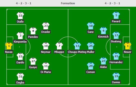 - PSG (4-2-3-1): Navas - Dagba, Danilo, Kimpembe, Diallo - Gueye, Paredes - Di María, Draxler, Neymar - Mbappe
