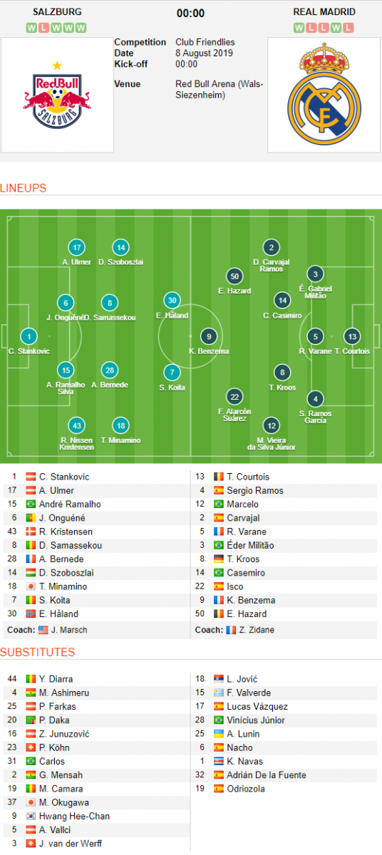 AEGoal.net cập nhật chính xác ĐỘI HÌNH RA SÂN trận RB Salzburg vs Real Madrid diễn ra lúc 00h00 ngày 08/8 trong khuôn khổ Giao hữu CLB.