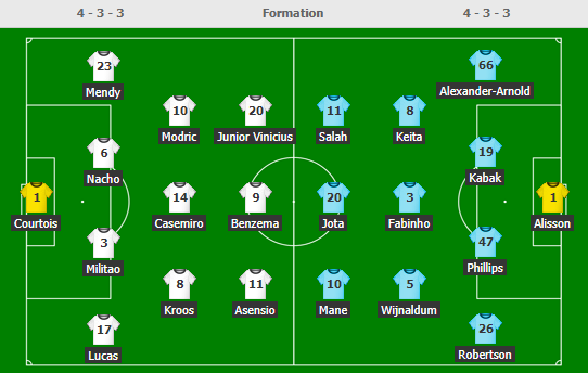 - Liverpool (4-3-3): Alisson - Alexander-Arnold, Phillips, Kabak, Robertson - Thiago, Fabinho, Wijnaldum - Salah, Jota, Mane