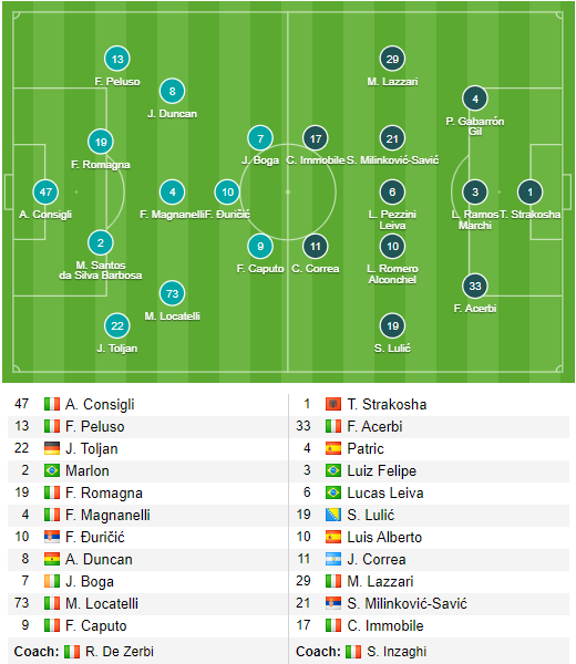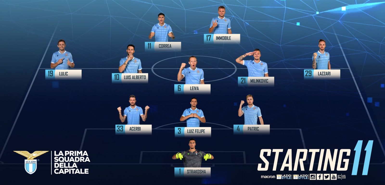 Lazio: Strakosha; Patric, Luiz Felipe, Acerbi; Lazzari, Milinkovic-Savic, Leiva, Luis Alberto, Lulic; Correa, Immobile