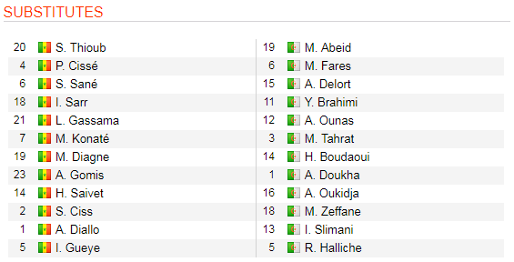 Senegal (4-1-4-1): Mendy - Sabaly, Koulibaly, Kouyate, Wague - Ndiaye - Keita, Gueye, Diatta, Sarr - Mane