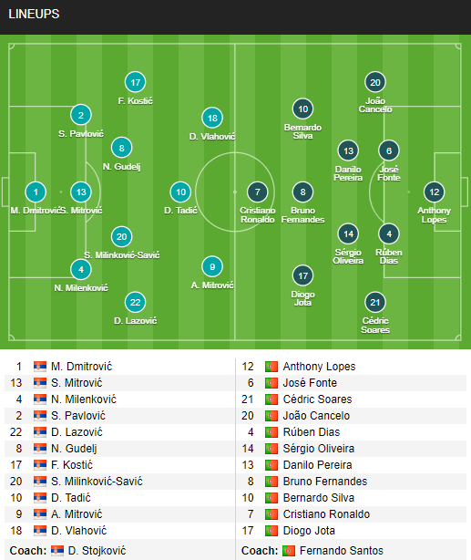 AEGoal cập nhật chính xác ĐỘI HÌNH RA SÂN trận Serbia vs Bồ Đào Nha diễn ra lúc 02h45 ngày 28/03 trong khuôn khổ Vòng loại World Cup 2022 khu vực châu Âu.