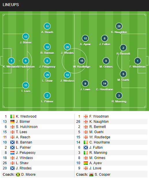 Sheffield Wed: Wildsmith; Harris, Lees, Borner; Palmer, Hutchinson, Bannan, Reach; Windass; Kachunga, Rhodes.