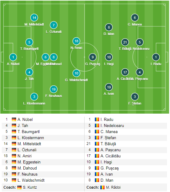 U21 Romania (4-2-3-1): Radu - Manea, Nedelcearu, Pascanu, Stefan - Cicaldau, Baluta - Man, Hagi, Coman - Puscas