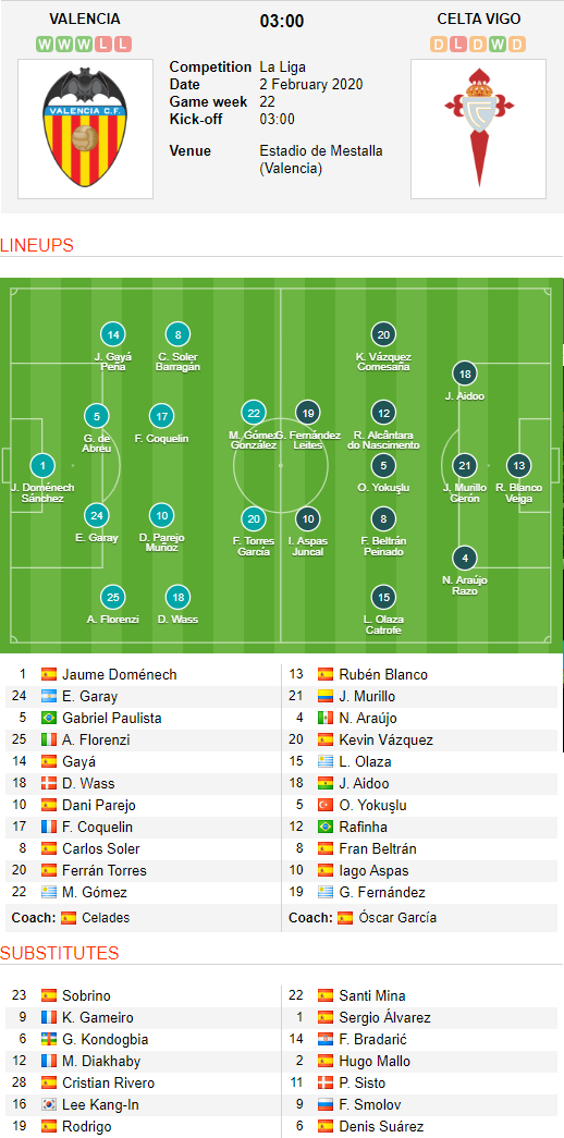 AEGoal.net cập nhật chính xác ĐỘI HÌNH RA SÂN trận Valencia vs Celta Vigo diễn ra lúc 03h00 ngày 02/2 trong khuôn khổ Vòng 22 - VĐQG Tây Ban Nha.