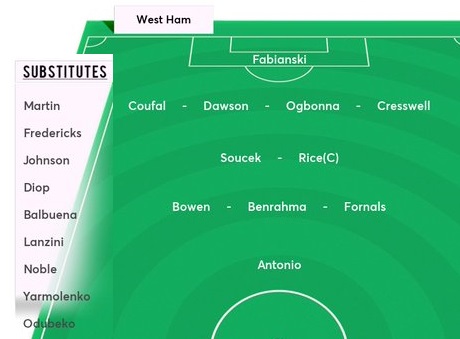 West Ham — Fabianski; Coufal, Dawson, Ogbonna, Cresswell; Soucek, Rice(C); Bowen, Benrahma, Fornals; Antonio.