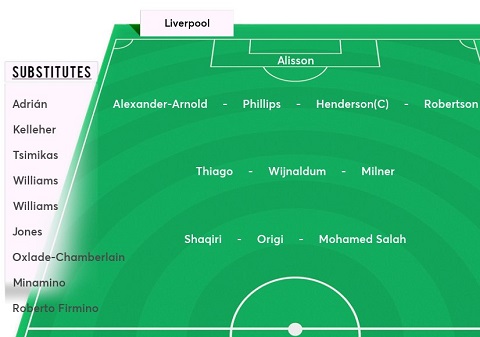 Liverpool — Alisson; Alexander-Arnold, Phillips, Henderson(C), Robertson; Thiago, Wijnaldum, Milner; Shaqiri, Origi, Mohamed Salah.