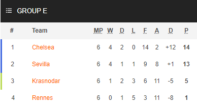 Chelsea góp mặt tại Bảng E cùng với đối thủ Sevilla, Krasnodar và đối thủ Pháp Rennais. Đây có thể coi là một bảng đấu dễ dàng với đại diện nước Anh khi hai đội thủ Krasnodar và Rennais quá chênh lệch về đẳng cấp với họ và Sevilla. Kết quả bảng đấu đã chứng minh điều đó khi Chelsea kết thúc vòng bảng với 4 trận thắng 2 hoà xếp đầu bảng E với 14 điểm, Sevilla cũng chỉ kém 1 điểm và đứng ở vị trí thứ 2 với 13 điểm.
