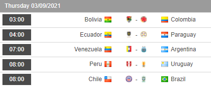 Cùng Aegoal điểm qua tình hình bảng đấu và lịch thi đấu, tỷ lệ châu Á các trận đấu của lượt 9 vòng loại World Cup 2022 khu vực Nam Mỹ