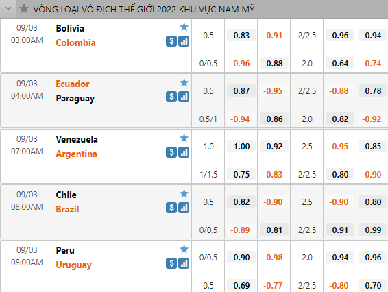 Colombia sẽ phải làm khách của Bolivia, việc phải thi đấu tại độ cao lớn khiến Colombia không được nhà cái đánh giá cao trận này, đội khách chỉ có mức tỷ lệ chấp 1/4. Ecuador với phong độ xuất sắc thời gian gần đây đã được nhà cái đánh giá ở cửa trên với tỷ lệ chấp 1/2 trên sàn giao dịch châu Á khi tiếp đón ĐT Paraguay. Ở trận đấu còn lại Uruguay làm khách của Peru với tỷ lệ chấp 1/4, mức tỷ chấp này cho thấy giới chuyên môn đang dự đoán Uruguay sẽ gặp khó khăn lượt đấu này.