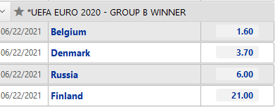 Theo đánh giá từ các nhà cái, Bỉ là đội có cơ hội chiếm vị trí nhất bảng cùng tấm vé đi tiếp cao nhất tại bảng B Euro 2020 năm. Điểm dành cho khả năng Bỉ dẫn đầu bảng có mức 1.60. Tiếp đến là Đan Mạch với 3.70 lần cho khả năng đứng nhất bảng.