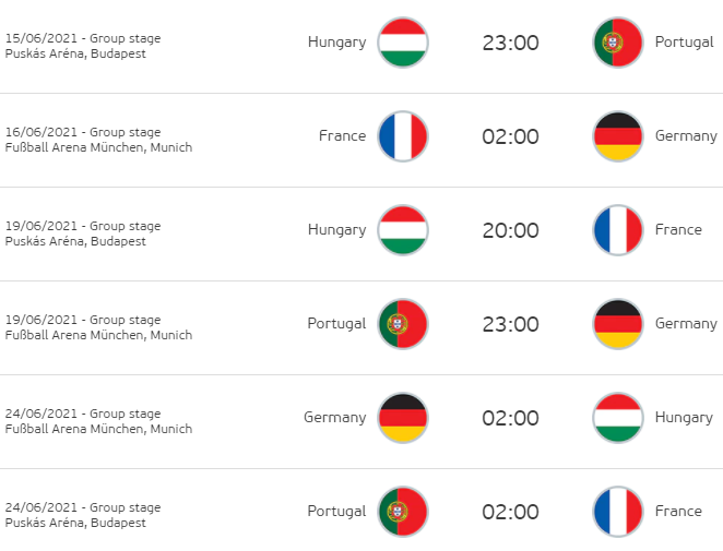 Bảng F của VCK Euro lần này được coi là bảng đấu tử thần khi có sự góp mặt của 4 ĐT: Pháp, Đức, Bồ Đào Nha và Hungary. Thành tích dự các VCK Euro của 4 ĐT như sau: