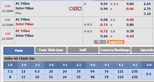 Hiệp 1: Tính riêng trong hiệp 1, Inter Milan đang là đội có thành tích hiệp 1 tốt hơn ở những trận đấu gần đây khi chưa từng để đối phương vươn lên dẫn trước trong hiệp 1 ở 4 trận gần nhất. Trong đó, cả 2 trận gần đây họ đều giành lợi thế về tỷ số trước kẻ thù trong 45 phút đầu. Trong khi đó, 4/5 trận gần nhất AC Milan đều để thủng lưới sớm trước khi bước vào hiệp thi đấu thứ 2. Ngoài ra, trong 3 lần chạm trán gần đây nhất của hai đội, Inter cũng đã 2 lần mang tới niềm vui sớm cho người hâm mộ trong hiệp 1. Chọn Inter Milan hiệp 1.