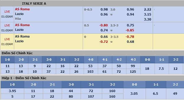 Tổng bàn thắng cả trận: Hiện tại, Roma đã từ bỏ lối chơi hào hoa để theo đuổi triết lý bóng đá chắc chắn của HLV Eusebio Di Francesco. Sau thất bại 1-3 trước Inter Milan ở vòng 2, họ chỉ nhận thêm 4 bàn thua ở 9 trận kế tiếp tại Serie A, trong đó 6 trận sạch lưới. Vì vậy, dù mức tổng bàn được ấn định 3 hòa, nhưng mốc trên không phải là lựa chọn sáng suốt. Cũng cần biết rằng, trận mới nhất của Lazio chỉ có vỏn vẹn 1 tình huống lưới rung. Chọn Dưới 3 bàn cả trận.
