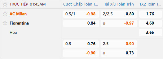 Tỷ lệ kèo AC Milan vs Fiorentina