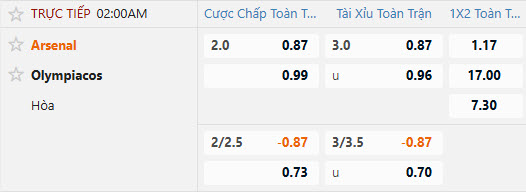 Tỷ lệ kèo Arsenal vs Olympiakos