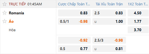 Mức kèo châu Á được giới chuyên gia niêm yết ở tỷ lệ 3/4:0, tức Áo chấp -3/4 dù phải thi đấu trên sân khách. Đó là minh chứng rõ ràng cho sự chênh lệch đẳng cấp giữa hai đội ở thời điểm hiện tại. Áo không chỉ dẫn đầu bảng H với 15 điểm tuyệt đối mà còn sở hữu hiệu số bàn thắng bại lên tới +17, trong khi Romania mới có +4 sau 5 lượt. Một đội thắng 5/5 trận, đội kia thắng 2 – thua 2 – chính là khoảng cách thực tế phản ánh trên kèo chấp này.