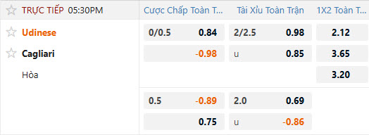 Tỷ lệ 0:1/4 cũng xuất hiện trong lần gần nhất Udinese tiếp đón Cagliari thuộc giải VĐQG Italia. Kết quả: Udinese giành 3 điểm qua đó thắng kèo.