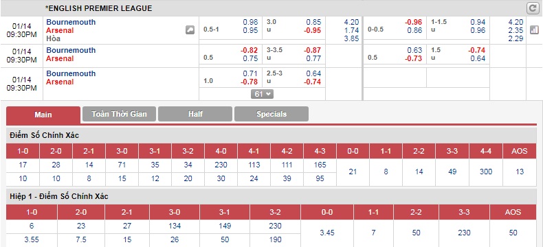 Xin lưu ý, cách đây chẵn 1 năm, với mức chấp 0:3/4, Arsenal đã bị cầm chân 3-3 khi đổ bộ xuống Dean Court. Đó là trận đấu mà họ bị dẫn 3-0 cho đến phút 58 và phải nhờ đến bàn thắng ở phút 90+2 của Olivier Giroud mới tránh được thất bại.