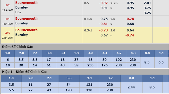 Tuy nhiên, giới điều khiển thị trường châu Á đang đánh giá Bournemouth ở thế cửa trên một cách rõ ràng hơn đáng kể. Tỷ lệ chấp 1/2 trên sàn giao dịch xuất hiện ngay từ thời điểm được niêm yết và duy trì ổn định đến đầu piheen khớp lệnh liên tục vào ngày thi đấu. Điều này khá bất ngờ bởi Bournemouth như đã phân tích ở trên phải đương đầu với đối thủ không hề dễ chịu như Burnley. Thành tích từ đầu mùa của đội chủ nhà là khiêm tốn hơn đáng kể nên mức kèo thông thường chỉ dừng lại ở mức chấp 1/4.