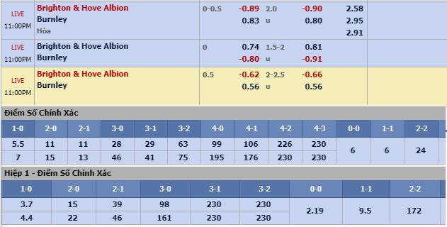 Tổng bàn thắng cả trận: Trước đây 2 đội từng nhiều lần chạm trán nhau tại các giải đấu hạng dưới nên có vốn hiểu biết thực tế rất đáng kể về nhau. Trong 14 lần đụng độ gần nhất thì có tới 11 trận khép lại với tối đa 2 bàn thắng. Ở thời điểm hiện tại rất khó chờ đợi vào sự khác biệt khi Burnley theo đuổi lối chơi phòng thủ chắc chắn để tích lũy điểm số trong từng trận đấu. Phía đối diện Brighton chỉ có 14 bàn từ đầu mùa, chưa đạt trung bình 1 bàn mỗi trận. Chọn Dưới 2 bàn thắng cả trận.