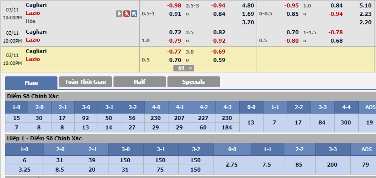Tổng bàn thắng cả trận: Tình trạng công làm thủ phá đang khiến cho Lazio gặp nhiều khó khăn hơn trong thời gian gần đây. Dù đứng thứ 4 trên bảng điểm nhưng Lazio vẫn là những người ghi được nhiều bàn thắng nhất giải là con số đủ cho thấy kịch bản rượt đuổi tỷ số thường xuyên xuất hiện trong các trận đấu của đại diện thủ đô. Trong khi đó, Cagliari vừa bị thủng lưới tới 7 bàn sau 2 trận gần đây. Chọn Trên 2 3/4 bàn cả trận.
