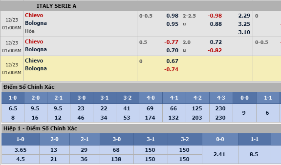 Trên khía cạnh tỷ lệ châu Á, Chievo đang là những người có số trận thắng kèo nằm trong nhóm 4 đội dẫn đầu Serie A lúc này với 58.82% số trận mang lại niềm vui cho dân chơi châu Á. Chỉ tính trên sân nhà, Chievo đã có tới 62.5%, đứng thứ 2 chỉ sau Sampdoria. Trong khi đó, Bologna đang trở nên mất phương hướng ở thời điểm hiện tại khi liên tiếp phụ bạc lòng tin của giới mộ điệu cả 3 trận gần nhất.