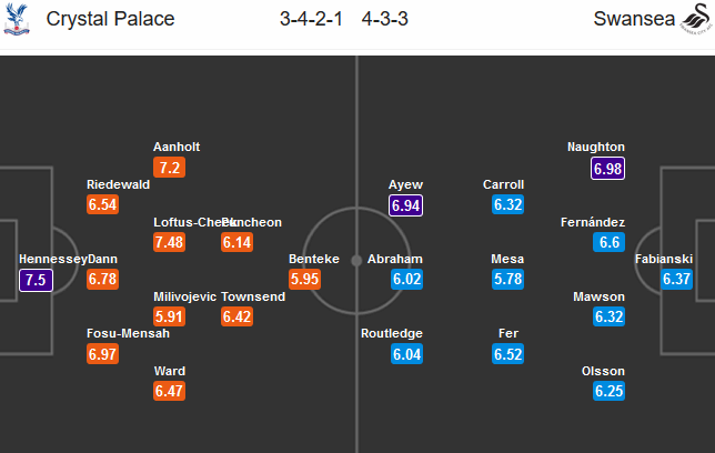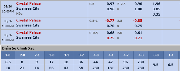 Niềm tin dành cho Crystal Palace ở trận đấu này ngoài lợi thế sân nhà, còn là thực lực từ đối thủ Swansea cũng không có gì nổi bật. Đại diện xứ Wales cũng chưa thắng trận nào, vẫn đi tìm bàn thắng đầu tiên ở mùa giải năm nay tại Premier League. Sau khi vất vả cầm chân Southampton với tỷ số 0-0 ở ngày khai mạc, Swansea làm nền cho màn phô diễn của MU khi chịu thất bại 4 bàn trắng ngay trên sân nhà. Cũng giống như Crystal Palace, Swansea không có hàng công đủ chất lượng để tạo ra sự khác biệt trong các tình huống uy hiếp khung thành đối phương.