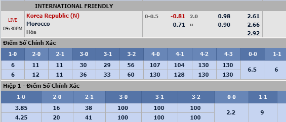 Hiệp 1: Morocco thường chơi rất tập trung trong hiệp 1 khi giữ sạch lưới liên tiếp 4 trận gần đây ở khoảng thời gian này. Trong khi đó, Hàn Quốc cách đây ít ngày để thủng lưới 4 bàn trước ghi gỡ lại 2 bàn danh dự. Tính ra, đội bóng xứ Kim chi đã không có bàn trong hiệp 1 liên tiếp 5 trận gần đây. Chọn Morocco hiệp 1.