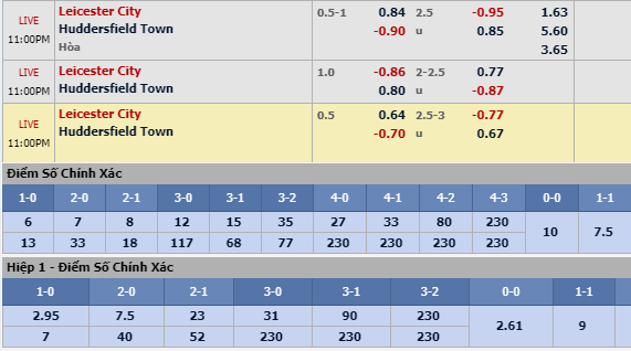 Tổng bàn thắng cả trận: Để tạo ra bất ngờ, Huddersfield đương nhiên phải gia cố hàng thủ trước khi nghĩ đến các đợt tấn công. Tinh thần đó được đội khách thực hiện trong thời gian gần đây và có tới 3 trận liên tiếp đều khép lại với tối đa 2 bàn thắng. Ngoài ra, việc cả 2 trận đối đầu vừa qua giữa hai đội có kịch bản không vượt quá 2 bàn cũng cho thấy giữa hai đội không có sự cộng hưởng nào về số bàn thắng. Chọn Dưới 2 1/2 bàn cả trận.