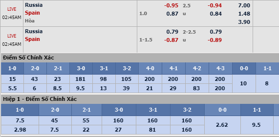 Tổng bàn thắng cả trận: Hàng công của tuyển Nga đang gặp những vấn đề nhất định về sự hiệu quả khi họ chỉ ghi được 1 bàn sau 2 trận gần nhất. Thực tế, đội chủ nhà thiếu tiền vệ thực sự tốc độ, sắc xảo để trở thành điểm tựa cho hàng tiền đạo có nhiều cơ hội hơn. Trong khi đó, Tây Ban Nha nhiều khả năng không thể phát huy hết khả năng vì điều kiện thời tiết và cuối tuần phải trở về CLB chủ quản. Chọn Dưới 2 1/2 bàn cả trận.