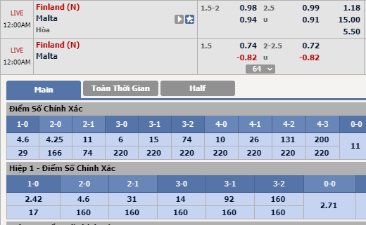 Tổng bàn thắng cả trận: Tỷ lệ châu Á được nhà cái niêm yết tới mức Phần Lan chấp 1 3/4 nhưng tổng bàn thắng chỉ dừng lại với kèo 2 1/2 khá sát nhau cho thấy giới điều khiển thị trường đánh giá thấp vào khả năng diễn ra trận đấu tưng bừng bàn thắng. Để tạo ra bất ngờ, Malta rõ ràng phải chơi phòng ngự chắc chắn. Chọn Dưới 2 1/2 bàn cả trận.