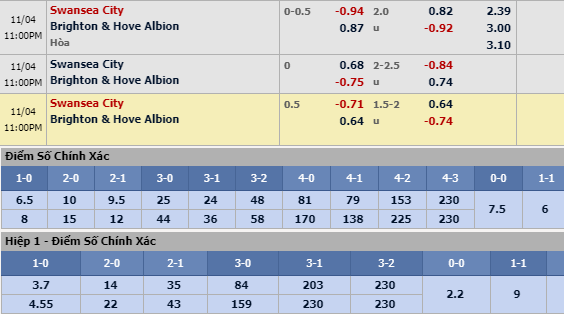 Tổng bàn thắng cả trận: Như bao đội bóng tân binh khác, Brighton luôn đề cao sự chắc chắn đến khi nào có thể. Chính lối chơi khó chịu nhưng đầy hiệu quả này khiến 5/6 trận gần nhất của đội khách chỉ kết thúc với tối đa 2 bàn thắng được ghi. Phía đối diện, Bony vắng mặt khiến Swansea gặp khó khăn trên hàng tiền đạo. Thực tế, đội chủ nhà chỉ có 7 bàn sau 10 vòng đầu tiên nên cũng không phải địa chỉ để chờ đợi vào số bàn thắng. Chọn Dưới 2 bàn cả trận.