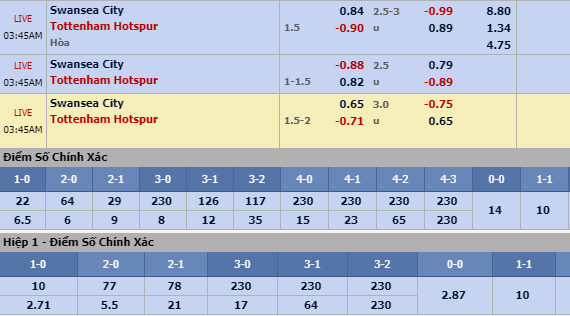 Tổng bàn thắng cả trận: Nhiều khả năng vẫn như thói quen, Swansea tiếp cận trận đấu với tâm thế thận trọng ở mức cao độ nhằm hạn chế sức mạnh từ Tottenham. Tuy nhiên, việc thiếu vắng trung vệ trụ cột Naughton sẽ không dễ để Thiên nga đen đảm bảo sự an toàn mành lưới. Hơn nữa, vấn đề thể lực đang có lợi thế lớn cũng là yếu tố quan trọng để Tottenham triển khai thế trận theo ý muốn với phong cách tấn công quen thuộc. Ngoài ra, việc có tới 7 trong 8 trận đối đầu gần nhất giữa hai đội đều kết thúc với ít nhất 3 bàn thắng cũng là yếu tố quan trọng. Chọn Trên 2 3/4 bàn cả trận.