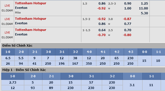 Hiệp 1: Everton không phải đối thủ dễ chơi tuy nhiên Tottenham vẫn rất tự tin về khả năng vươn lên dẫn trước khi sở hữu Harry Kane trong đội hình. Hiện ngôi sao 24 tuổi vẫn đang là chân sút xuất sắc nhất Premier League tại thời điểm này với 18 bàn ghi được. Thống kê cũng cho thấy, trong 10 trận gần đây thì có tới 7 trận Spurs nổ súng ngay trong hiệp đấu đầu tiên. Theo đó, chiếu theo mốc tỷ lệ -3/4 hiệp 1, đội chủ nhà vẫn sẽ là cửa cược tốt dành cho các nhà đầu tư.