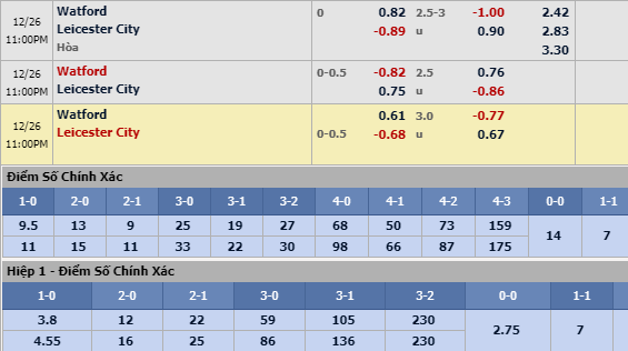 Tổng bàn thắng cả trận: Trong 7 trận đối đầu gần nhất giữa hai đội, có tới 6 lần khép lại với ít nhất 3 bàn thắng được ghi. Hơn nữa, ở thời điểm hiện tại đang chứng kiến Watford mất phương hướng dưới hàng hậu vệ khi cả 6 trận gần nhất đều bất lực trong việc giữ sạch lưới. Cùng với đó, 4/5 trận vừa qua của Leicester City đều khép lại với ít nhất 3 bàn cũng là chi tiết đáng lưu ý. Chọn Trên 2 3/4 bàn cả trận.