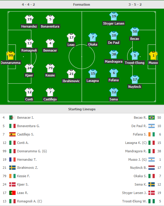 AEGoal.net cập nhật chính xác ĐỘI HÌNH RA SÂN trận AC Milan vs Udinese diễn ra lúc 18h30 ngày 19/1 trong khuôn khổ Vòng 20 - VĐQG Italia.