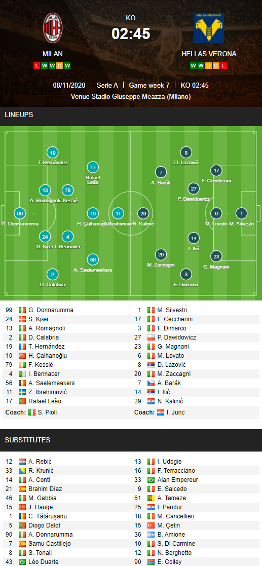 AEGoal cập nhật chính xác ĐỘI HÌNH RA SÂN trận AC Milan vs Verona diễn ra lúc 02h45 ngày 09/11 trong khuôn khổ giải VĐQG Italia.