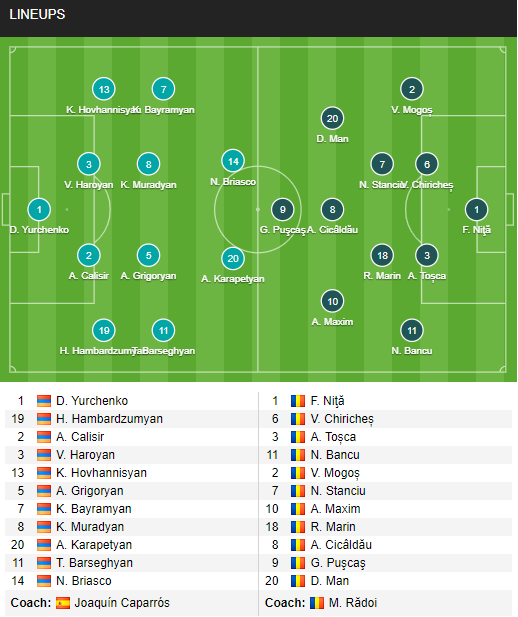 AEGoal cập nhật chính xác ĐỘI HÌNH RA SÂN trận Armenia vs Romania diễn ra lúc 23h00 ngày 31/3 trong khuôn khổ Vòng loại World Cup.
