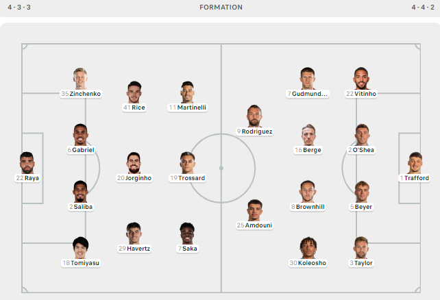 Arsenal (4-3-3): Raya; White, Saliba, Gabriel Magalhaes, Zinchenko; Havertz, Jorginho, Rice; Martinelli, Trossard, Nketiah.