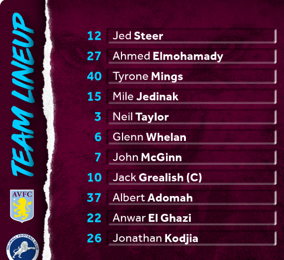 Aston Villa (4-1-4-1): Steer; Tuanzebe, Mings, Taylor, El Mohamady; Whelan; Adomah, McGinn, Grealish, El Ghazi; Abraham.