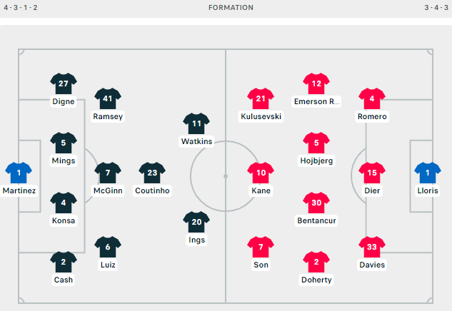 AEGoal cập nhật chính xác ĐỘI HÌNH RA SÂN trận Aston Villa vs Tottenham diễn ra lúc 23h30 ngày 09/04 trong khuôn khổ giải Ngoại hạng Anh.