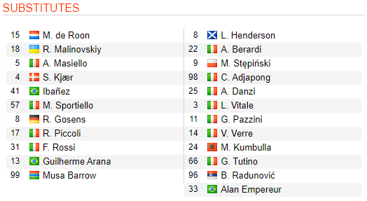 Atalanta: Simon Kjaer, Duván Zapata (chấn thương).
