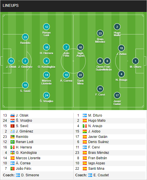 Celta Vigo: Dituro; Mallo, Aidoo, Araujo, Galan; Beltran; Mendez, Suarez, Cervi; Mina, Aspas