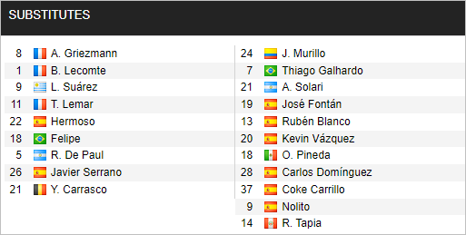 Atletico Madrid: Oblak; Vrsaljko, Savic, Gimenez, Reinildo; Llorente, Kondogbia, Herrera, Carrasco; Suarez, Felix