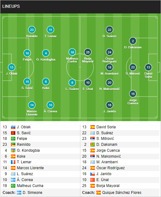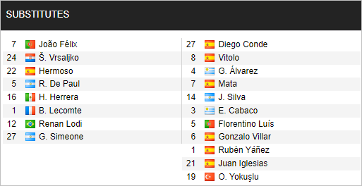 Atletico Madrid: Oblak; Vrsaljko, Savic, Gimenez, Hermoso; De Paul, Koke, Lemar; Carrasco, Suarez, Correa