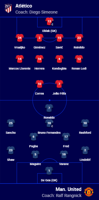 AEGoal cập nhật chính xác ĐỘI HÌNH RA SÂN trận Atletico Madrid vs Man Utd diễn ra lúc 03h00 ngày 24/02 trong khuôn khổ lượt đi vòng 1/8 cúp C1 Châu Âu.